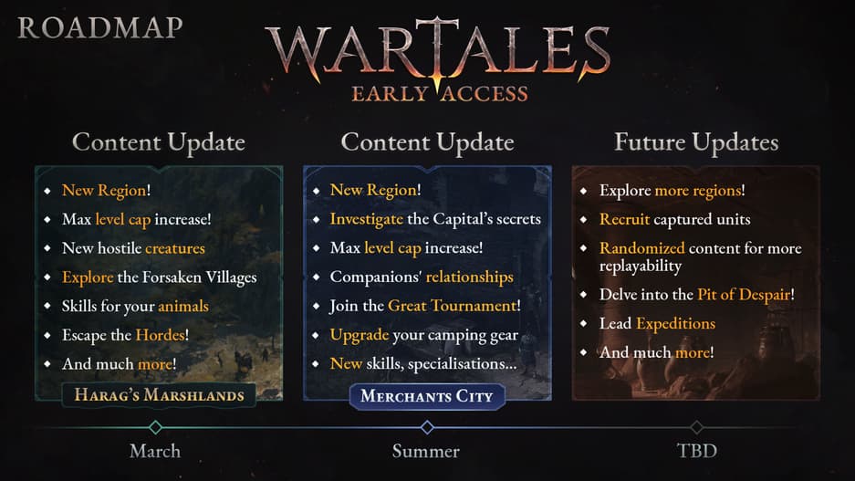 В декабре прошлого года в Steam Early Access стартовала ранняя версия Wartales от авторов Northgard, игры, сочетающей элементы стратегии и RPG. Она уже получила два обновления – первое спустя несколько дней после премьеры, а второе в прошлую среду. Теперь создатели раскрыли планы развития проекта на ближайшие месяцы.