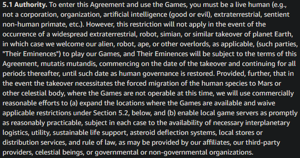Согласно этому пункту, принять данное пользовательское соглашение и приступить к игре может лишь живой человек, но никак не инопланетное существо, искусственный интеллект или разумный примат. Однако юридический отдел разработчиков уточняет, что пункт теряет всякую силу, если планета подверглась вторжению инопланетных интервентов, ее жители борются с восстанием разумных приматов или пытаются совладать с отбившемся от рук ИИ — в таком случае разработчики только рады новым подписчикам.