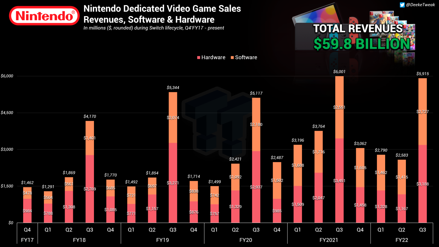Согласно статистике, Nintendo заработала больше на продажах устройств, чем на продажах программного обеспечения. 55% - 33,16 млрд долларов от продаж различных моделей Switch, 3DS и Wii U и 45% - 26,63 млрд долларов от продаж игр. Но продажи 3DS и Wii U значительно меньше.
