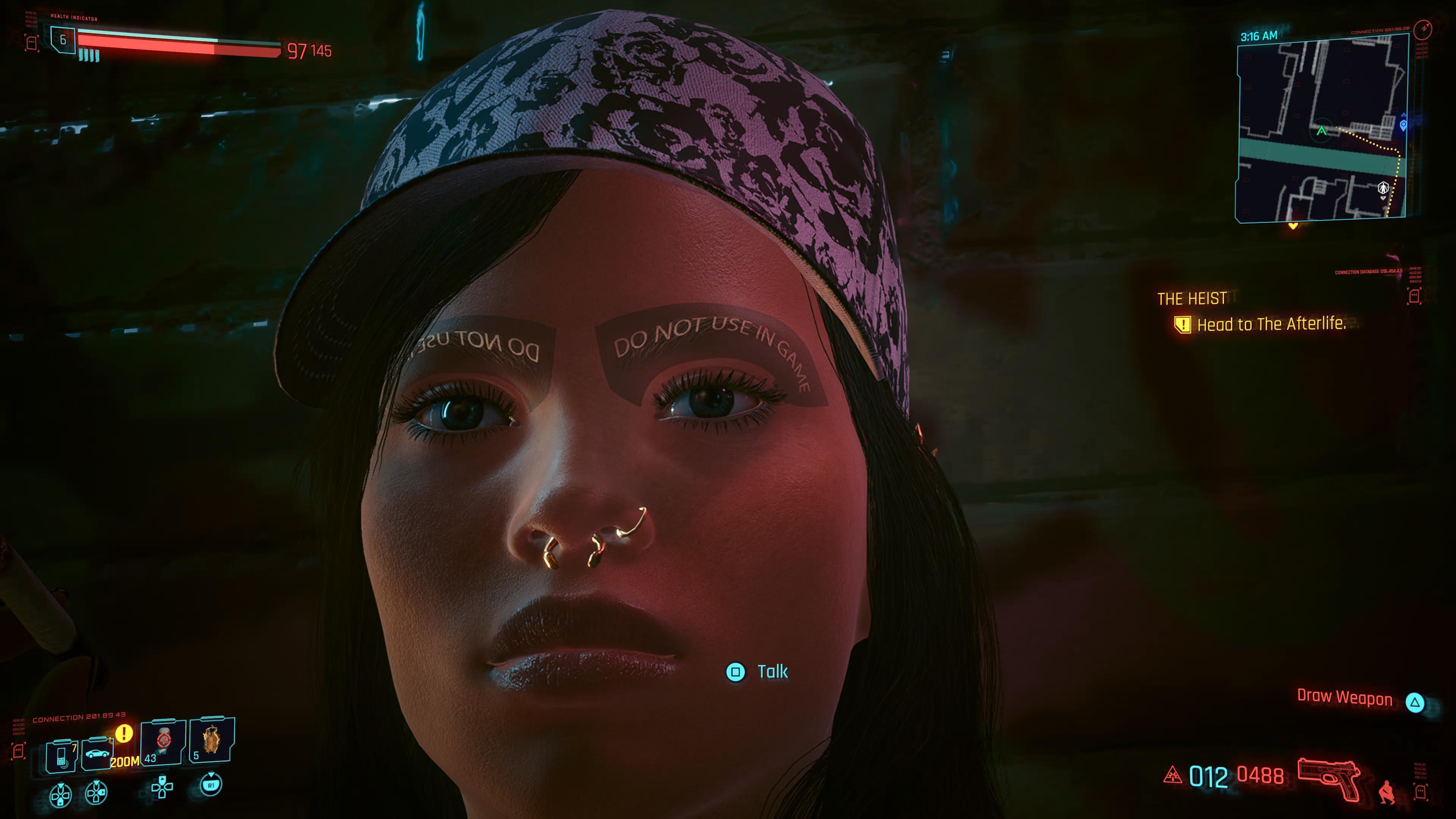 Поверх бровей нанесена надпись «DO NOT USE IN GAME», т.е. «не использовать в игре». Cyberpunk 2077 довольно масштабная игра. Вероятно, в ходе работы файл пропустили, и в результате он попал в финальную версию.