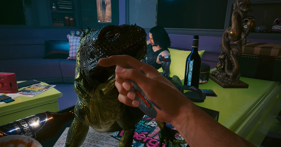 Недавно Cyberpunk 2077 получила крупное обновление 1.5 и похоже, что не все нововведения отразили в патчноуте в полной мере. В частности, игроки обратили внимание на возможность завести нового питомца игуану.