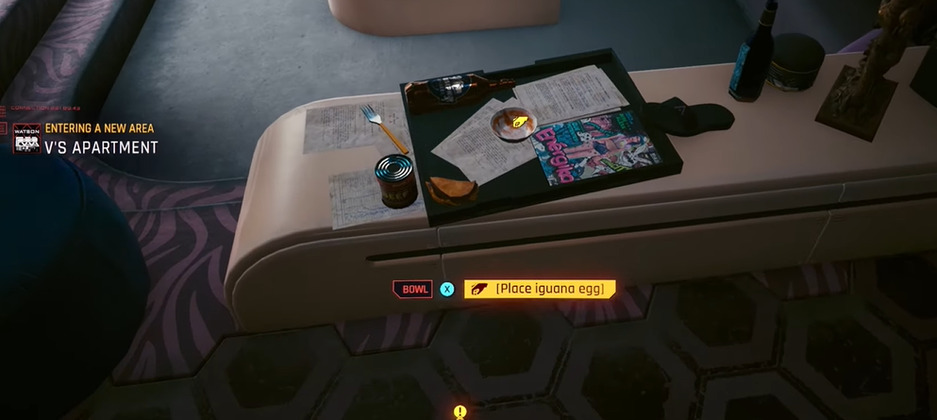 После продвижения по сюжету в квартире Ви должна появиться тарелочка (1:05), на которую надо установить найденное яйцо: