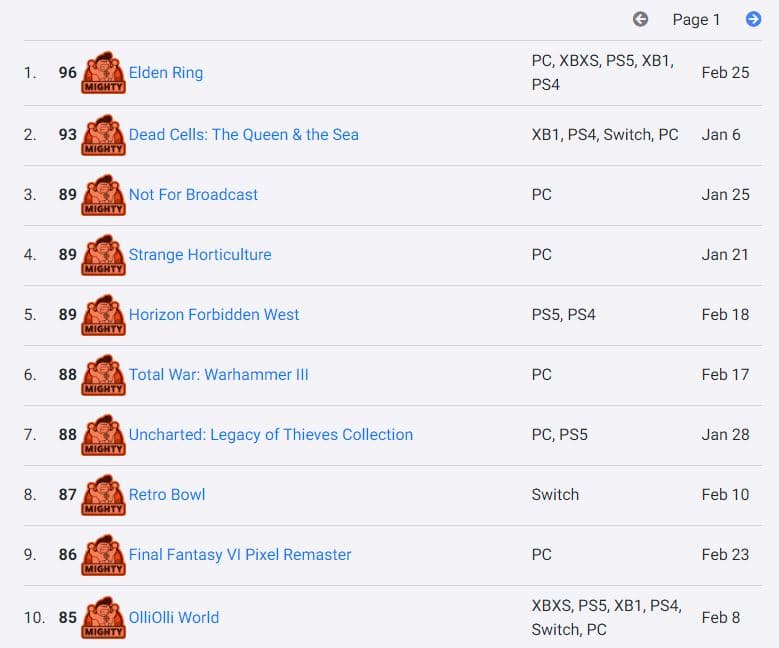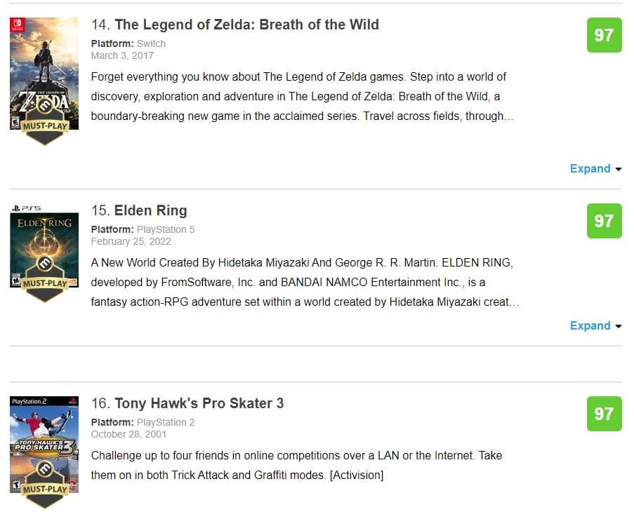 Восторженных отзывов и высоких оценок прессы хватило Elden Ring, чтобы войти в список самых высоко оцененных игр на агрегаторе Metacritic. Речь идет о версии для PlayStation 5, заработавшей 97 баллов из 100 и расположившейся на 15 месте между The Legend of Zelda: Breath of the Wild и Tony Hawk's Pro Skater 3. На ПК и Xbox Series X у последнего творения From Software 95 баллов.