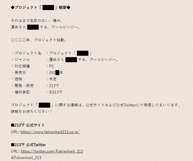 Студию Fahrenheit 213 основал Юсукэ Сиокава (Yosuke Shiokawa), в портфолио которого: Kingdom Hearts, Dissidia Final Fantasy, I am Setsuna и Fate/Grand Order.