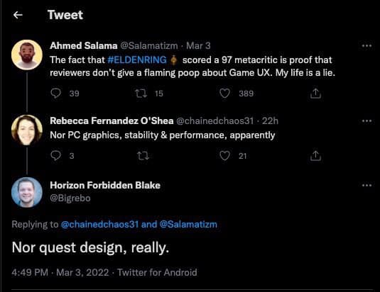 «Один тот факт, что Elden Ring получила 97 баллов на Metacritic, говорит о том, что рецензентам безразличен пользовательский интерфейс. Мая жизнь была ложью», — заявил UX-дизайнер Ubisoft Ахмед Салама.