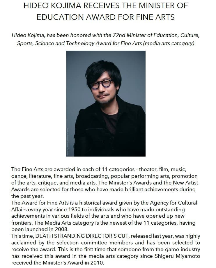 Известный геймдизайнер и основатель студии Kojima Productions Хидео Кодзима получил премию от Министерства образования Японии в области изящных искусств за режиссерскую версию Death Stranding, вышедшую в 2021 году.