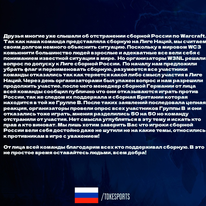 Российскую сборную исключили с турнира Warcraft III Nations League. Большинство команд отказалось с ней играть, а следовательно, им бы присуждали техническое поражение. Так она могла легко победить.