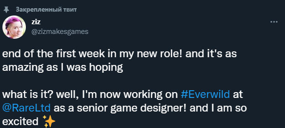 Теперь в команде Everwild, новый ведущий геймдизайнер. Им стала Элизабет Симоэнс (Elizabeth Simoens). В Twitter она обратилась к подписчикам: «Только что закончилась моя первая неделя на новой работе - удивительный опыт, как я и надеялась. Над чем я работаю? Ну, я разрабатываю Everwild вместе с Rare в качестве старшего [senior] гейм-дизайнера!».