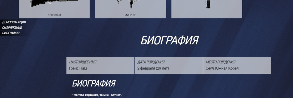 Для сравнения, под разделом «снаряжение» у корейской оперативницы DOKKAEBI, как и у многих других, расположен блок с биографией.