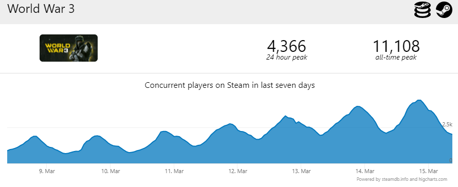 В последнее время онлайн в платном шутере World War 3 был довольно низок, менее 1 тысяч игроков. Однако, в последнее время ежедневный пиковый онлайн начал увеличиваться.