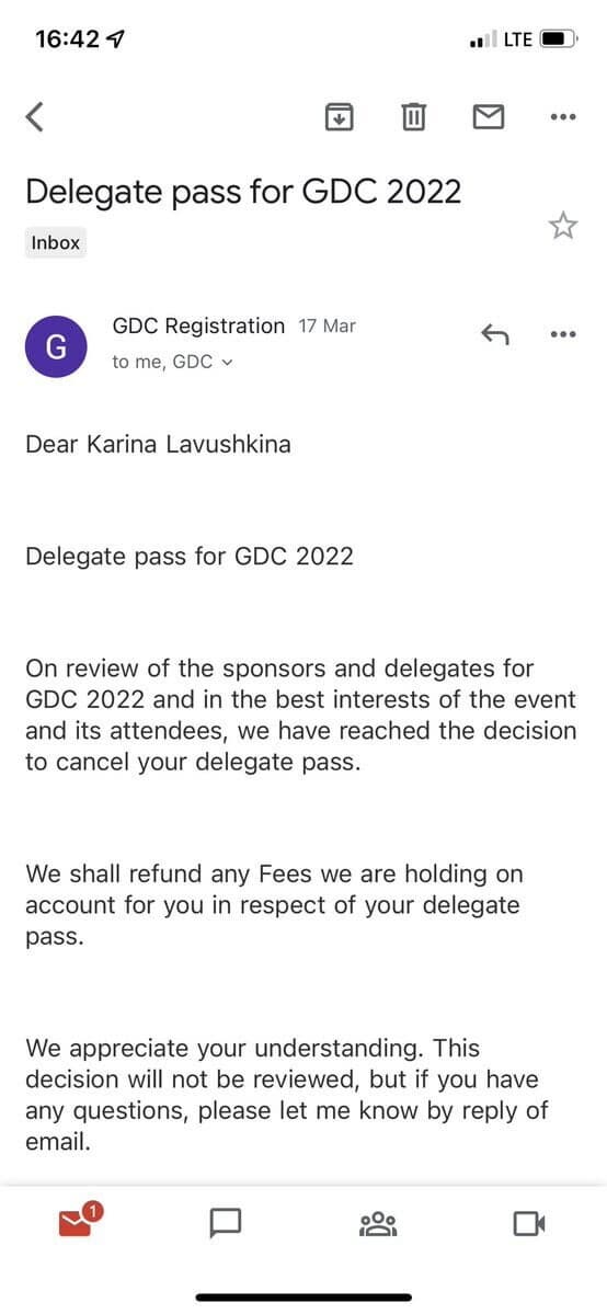 Также важно отметить, что аннулируют билеты участникам «из России», даже не проверяя принадлежность участника стране. Одной из первых о ситуации сообщила гражданка Украины Карина Лавушкина, работающая PR-директор в Pixonic.