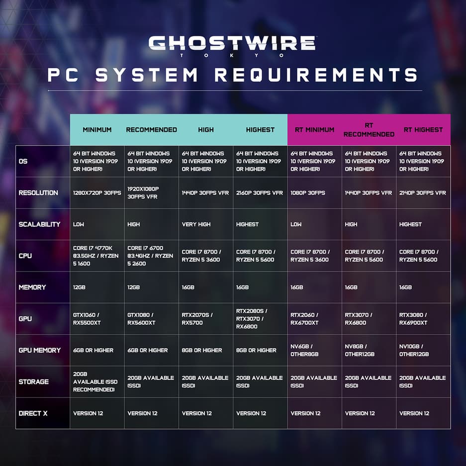 Требования Ghostwire: Tokyo к ПК, которые называли в феврале уже устарели. За три дня до релиза игры разработчики раскрыли в Twitter новые минимальные и рекомендуемые конфигурации. В подробной таблице можно найти и ряд других спецификаций, позволяющих определить, какое «железо» потребуется для игры на самых высоких графических настройках или с включенной трассировкой лучей.