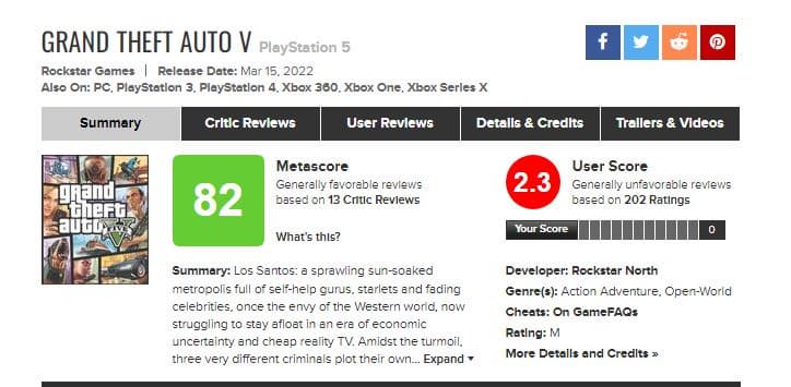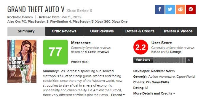 Рядовые обыватели в очередной раз не поняли причин хвалебных отзывов прессы в адрес обновленной версии Grand Theft Auto 5, ставшей доступной на консолях PlayStation 5 и Xbox Series X|S. Пользовательский рейтинг игры на Xbox сейчас составляет всего 2.2 балла, а на PlayStation — 2.3 балла.