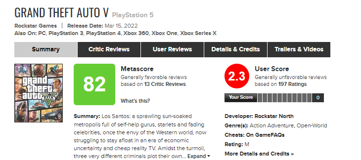 Сейчас у Grand Theft Auto 5 для PlayStation 5 пользовательская оценка на уровне 2.3 балла.