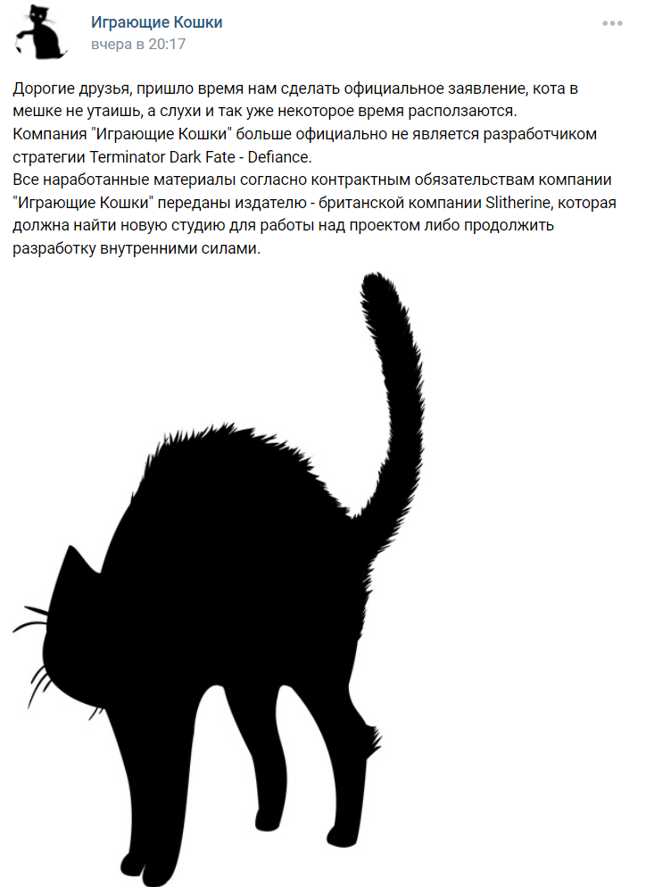 25 марта команда объявила о том, что больше не работает над Terminator Dark Fate Defiance: «Компания "Играющие Кошки" больше официально не является разработчиком стратегии Terminator Dark Fate - Defiance. Все наработанные материалы согласно контрактным обязательствам компании "Играющие Кошки" переданы издателю - британской компании Slitherine».