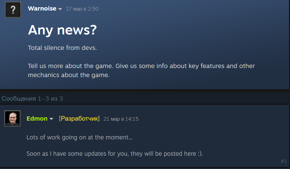 Ещё 21 марта разработчик на форуме в Steam писал: «Сейчас идет много работы...Как только появятся новости, они будут опубликованы здесь :)».