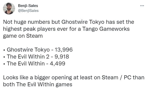 Независимый аналитик Benji-Sales в Twitter в обратил внимание, что в день выхода пик Ghostwire Tokyo составил почти 14 000 одновременных игроков, что существенно выше, чем у The Evil Within (4 499) и The Evil Within 2 (9 918), хотя и не слишком поражает.