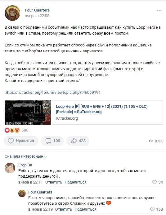 Вечером 27 марта студия Four Quarters в соцсети «ВКонтакте» ответила на вопрос, как купить Loop Hero в Steam и eShop.