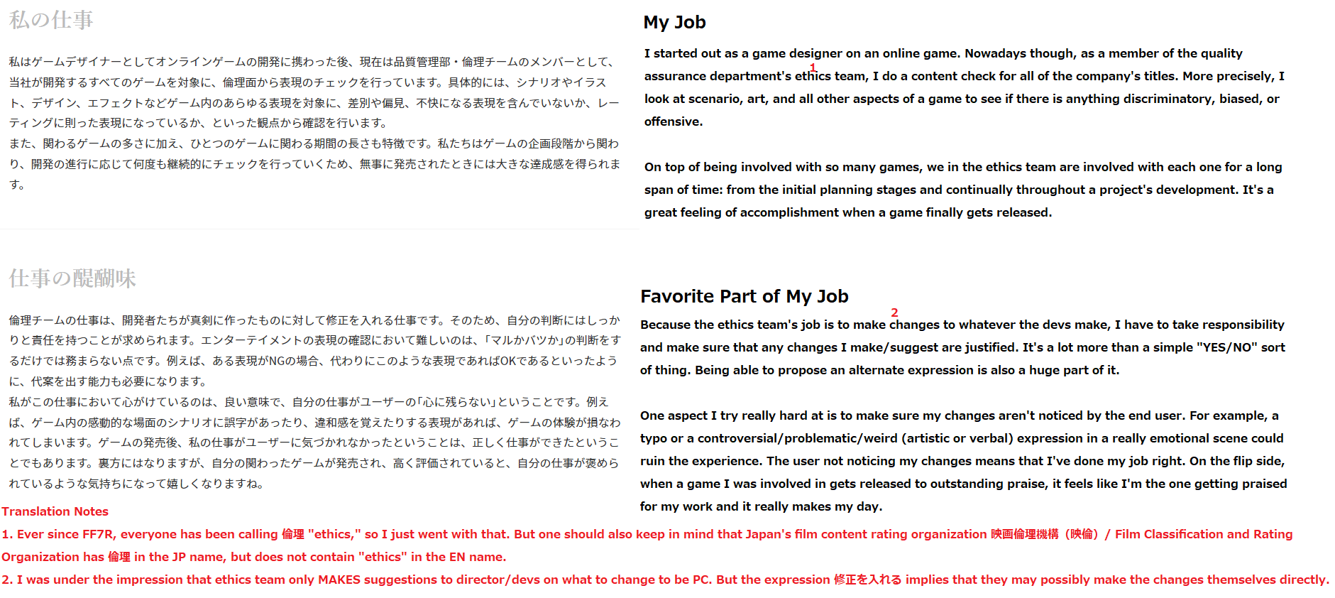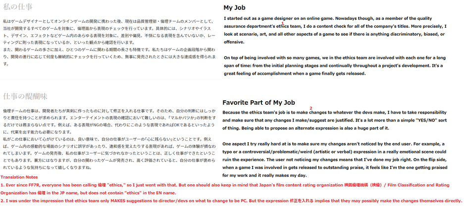 В Square Enix трудится целый департамент этики, члены которого обязаны внимательно изучать труды дизайнеров, художников, аниматоров и других работников компании, выискивая «дискриминационный, оскорбительный и предвзятый» контент. Это выяснилось из напутственного письма одного из сотрудников данного департамента, с которым могут ознакомиться люди на странице открытых вакансий.