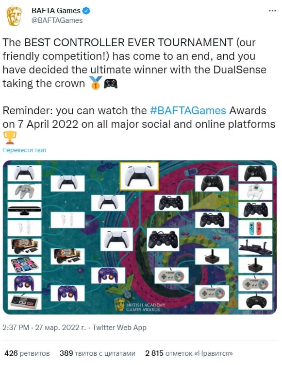 Перед мероприятием BAFTA Games организовала конкурс, в котором приняли участие игроки – сообщество выбрало лучший контроллер в истории.