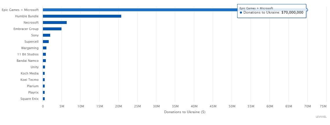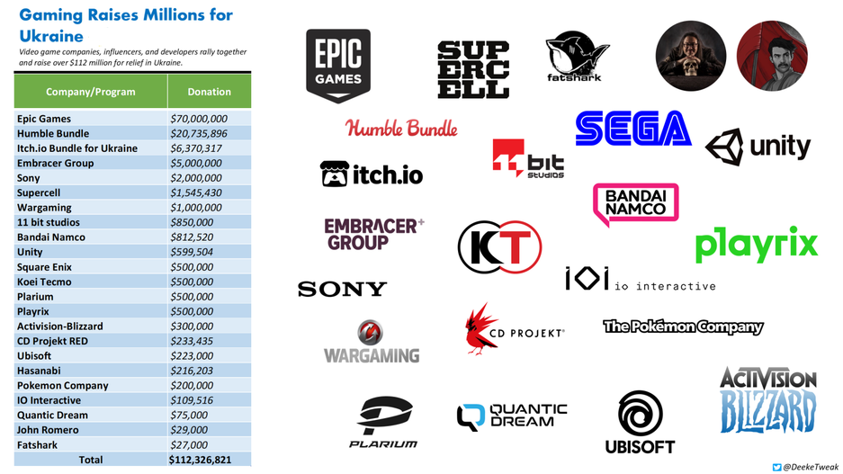 Ниже приведён не исчерпывающий список известных пожертвований. Возглавляет перечень Epic Games и Microsoft с 70 миллионами долларов, полученными от доходов Fortnite на ПК и Xbox. Затем Humble Bundle с бандлом Stand With Ukraine, а на третьем месте - мегапакет Bundle for Ukraine на Itch.io, заработавший более 6,3 миллиона долларов.