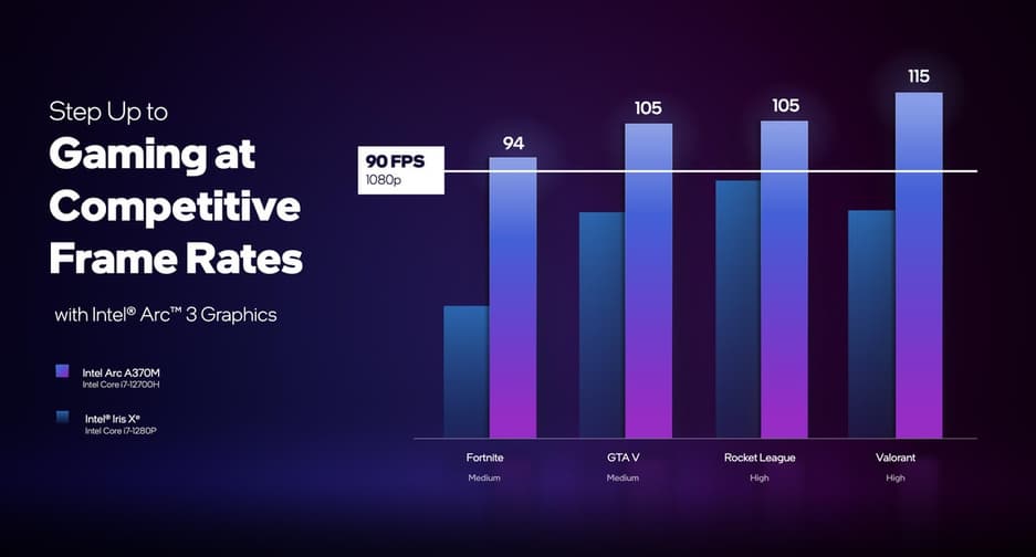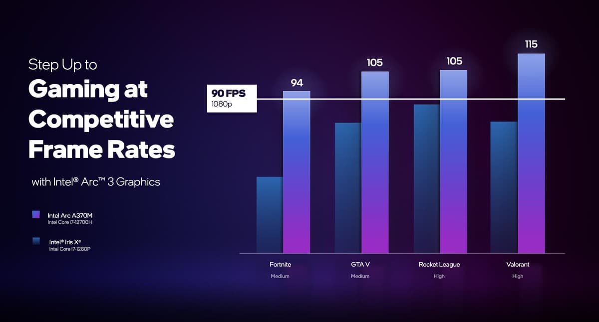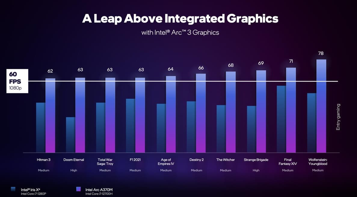 Intel только начинает осваивать рынок. Сначала компания выпустит наименее производительные графические процессоры серии Arc 3 (A350M с шестью ядрами Xe и шестью блоками RT и A370M с восемью ядрами Xe и восемью блоками RT).