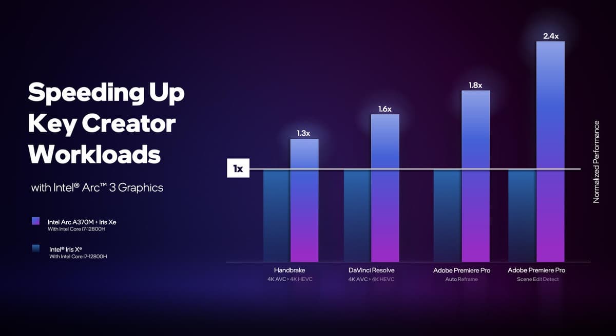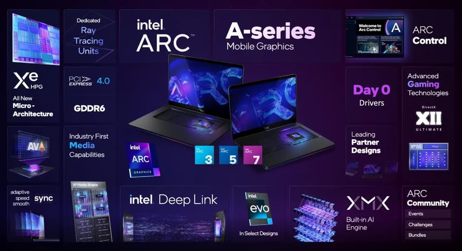 В первую очередь устройства попадут в ноутбуки - серия Intel Arc A, где будет обеспечена поддержка DirectX 12, поддержка трассировки лучей и примерно вдвое большая производительность, чем у интегрированных чипов Intel Xe.