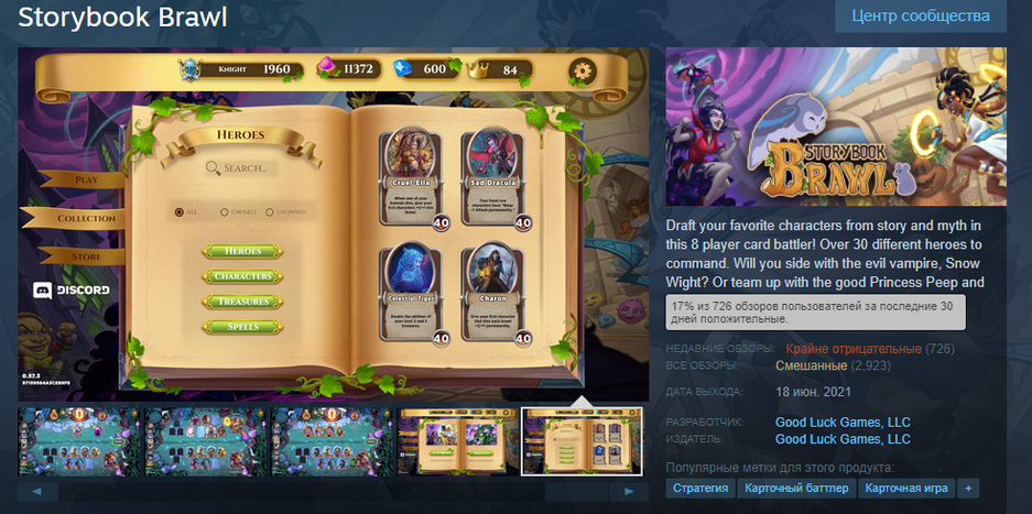 Условно-бесплатная карточная коллекционная игра Storybook Brawl попалась в немилость сообщества. Рейтинг игры в Steam пока остановился на отметке «Смешанные обзоры», а за последние 30 дней игра получает «Крайне отрицательные» отзывы. Лишь 17% положительных.