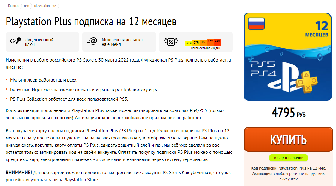 На playo годовую подписку PlayStation Plus предлагают приобрести за 4795 рублей. Если верить последнему отзыву, то код высылают на почту. Однако, другие отзывы состоят только из кодов (вероятно, на скидку).