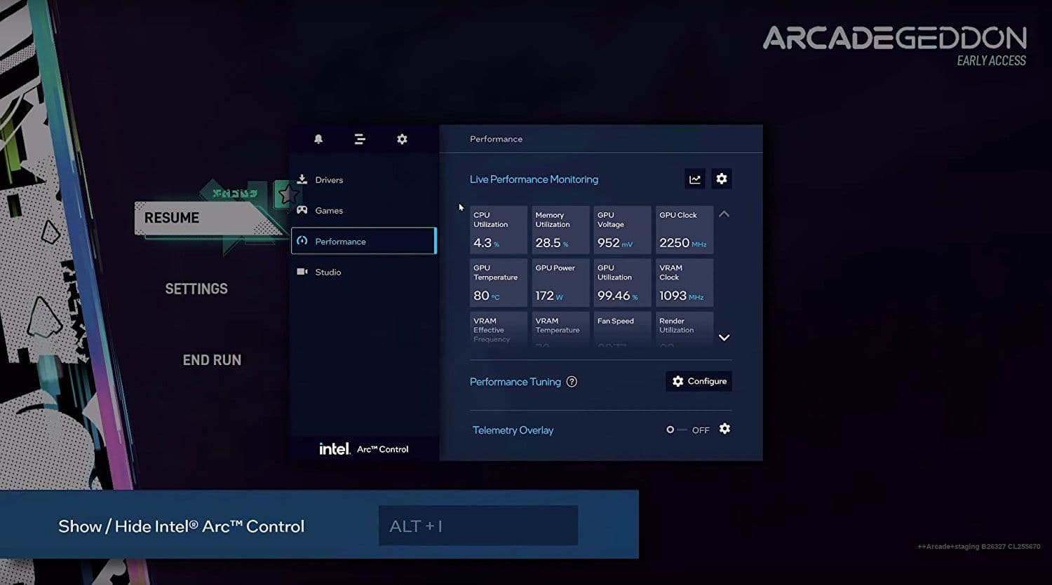В видео есть несколько кадров из раздела мониторинга Arc Control, напоминающего GeForce Experience от Nvidia. Видно, что карта потребляет 175 Вт при нагрузке 99,57%. Это первая подсказка. Вторая - тактовая частота: 2250 МГц для графического чипа и 1093 МГц для VRAM.