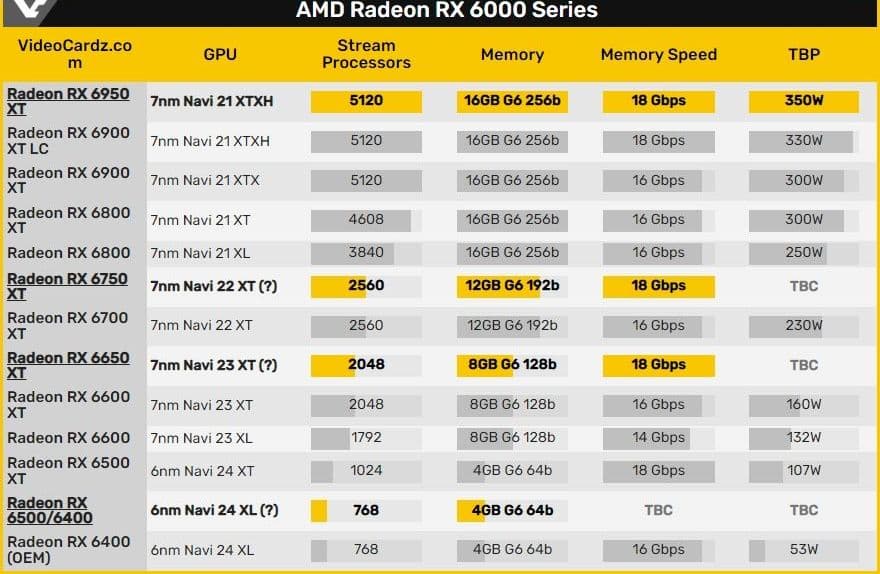Компания должна представить три обновлённые видеокарты Radeons текущего поколения RDNA 2, оснащённые новым охлаждением и более быстрой памятью: RX 6650 XT, 6750 XT и 6950 XT.