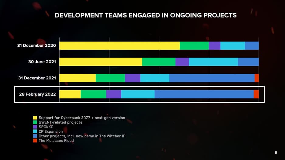 По состоянию на 28 февраля небольшая команда работает над улучшением Cyberpunk 2077, чуть больший коллектив трудится над «Гвинтом», студия SPOKKO поддерживает мобильную The Witcher, ведётся работа над проектом The Molasses Flood. Также подтверждено, что примерно половина студии работает над «другими проектами, включая новую The Witcher».