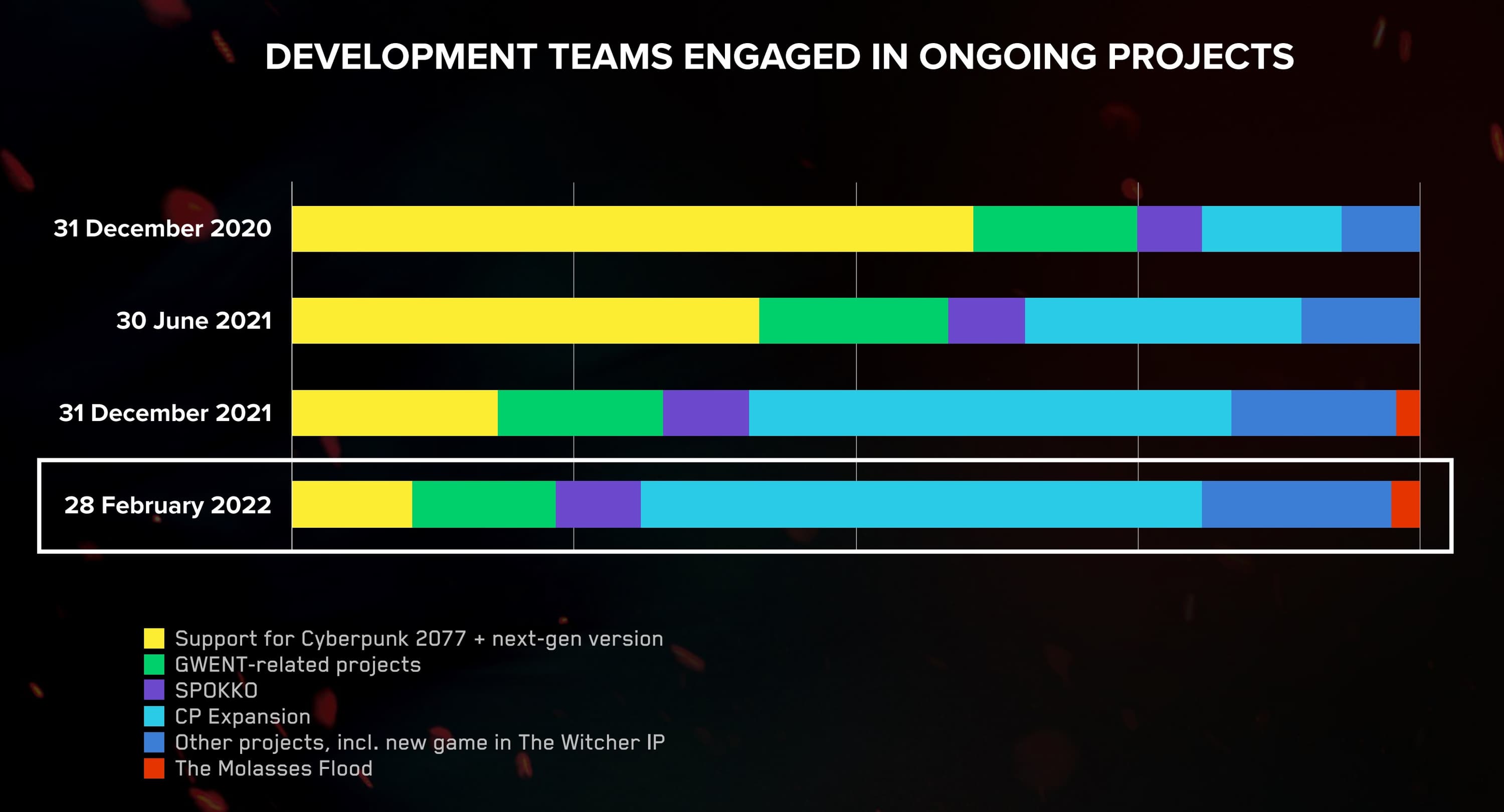 Внезапно, крупнейшим подразделением стал коллектив, который занимается дополнением для Cyberpunk 2077. Студия обновила картинку с графиком, связанным с разделением команд.