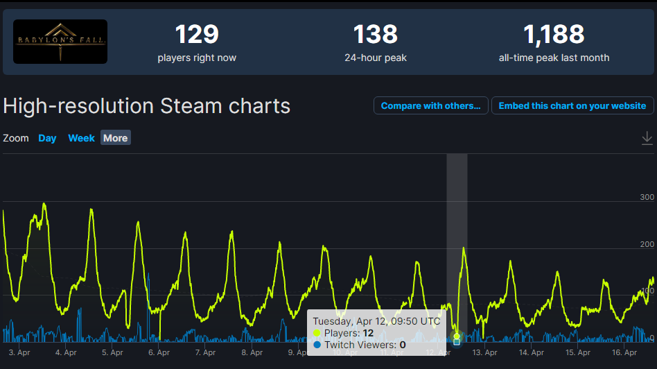 Провальный экшен Babylon's Fall переживает не лучшие времена — сейчас онлайн игры не превышает 140 человек, а в определенный момент падал и вовсе до 12 игроков.