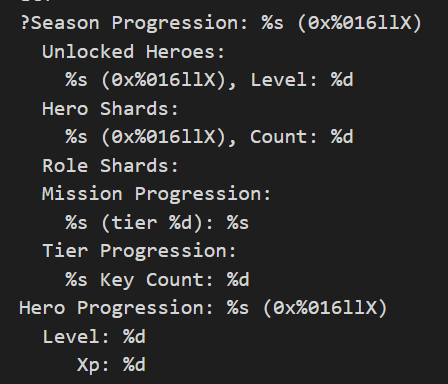 Помимо упоминания боевого пропуска, есть следы PvE, неких миссий (прогресс в процентах), есть информация про прогрессию: разблокированные герои, shards роли и героя.