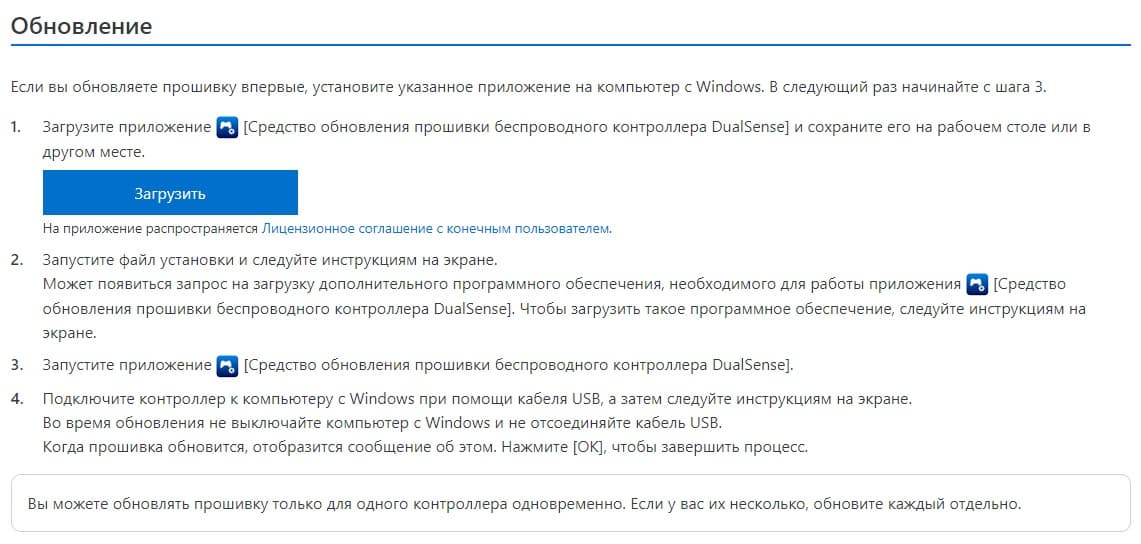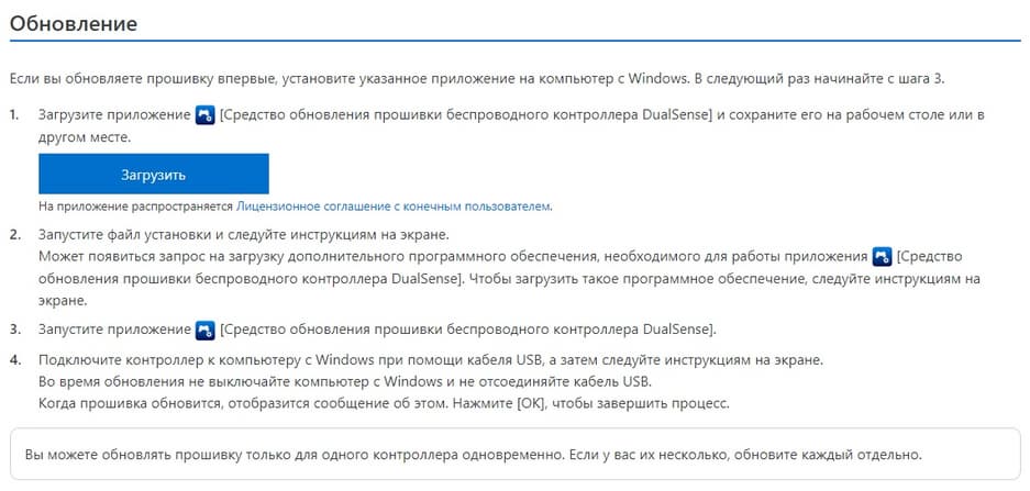 «Чтобы улучшить работу беспроводного контроллера DualSense, обновите прошивку. Перед использованием обязательно обновляйте ее до последней версии. Для обновления воспользуйтесь компьютером с Windows и приложением [Средство обновления прошивки беспроводного контроллера DualSense]».