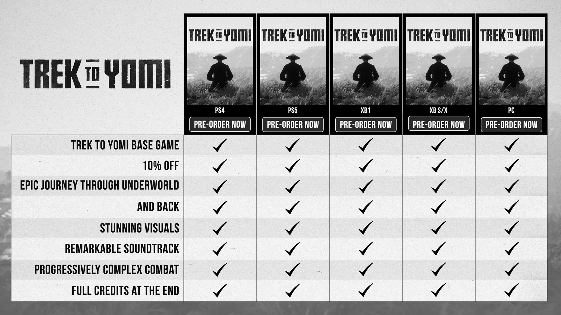 Как пояснила Devolver Digital: «Наш отдел маркетинга создал удобное руководство по предварительному заказу "Trek to Yomi". Пожалуйста, воспользуйтесь им, чтобы сориентироваться на пути к покупке».