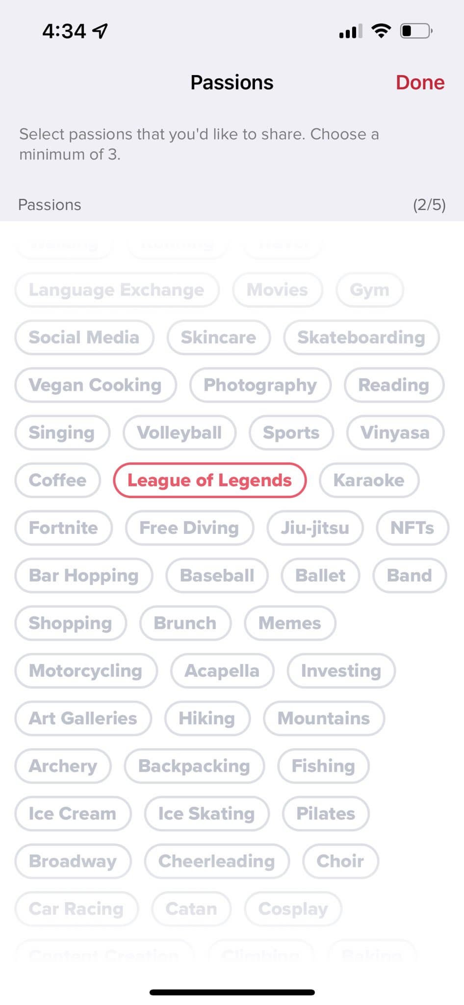 Функция указать свою «страсть» появилась в Tinder относительно недавно. Помимо League of Legends она позволяет выбрать NFT, Fortnite и другие увлечения.