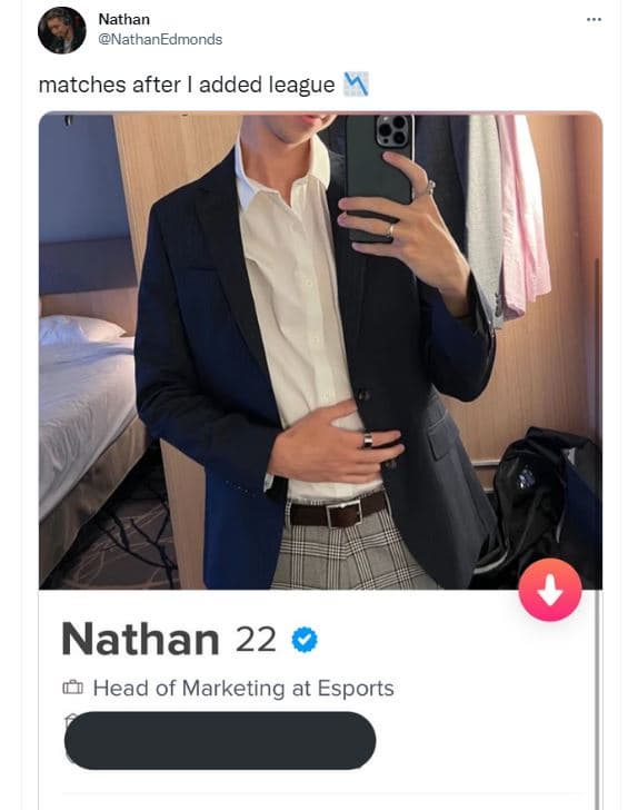 Нэйтан Эдмондс, глава сообщества и маркетинга киберспортивной платформы Hitmarker, сообщил, что как только он указал League of Legends как свою «страсть» в Tinder, его популярность среди девушек резко упала.