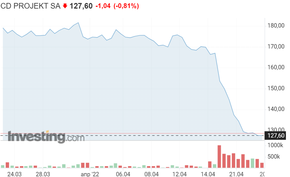 Недавний финансовый отчёт CD Projekt RED закончился падением стоимости акций. 19 апреля появилась информация о том, что за сутки польская компания подешевела на 10,24% до 149,90 польских злотых за акцию. Однако, на этом падение не остановилось.