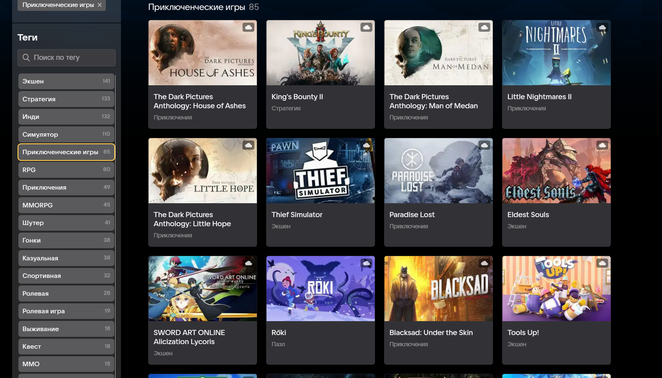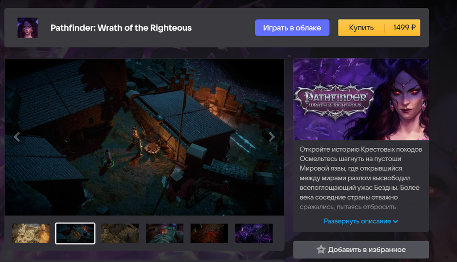 В магазине представлены различные игры, например недавняя Pathfinder: Wrath of the Righteous. На странице игры сразу есть кнопка «играть в облаке».