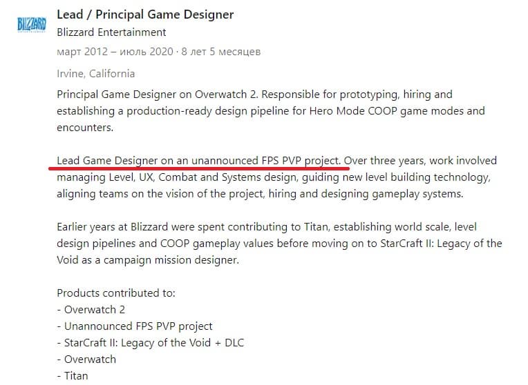 Пользователь Twitter с ником Faizan Shaikh обнаружил в LinkedIn профиль Кристофера Хоула, который последние годы работает ведущим геймдизайнером в Blizzard, интересную информацию. Помимо того, что Хоул трудится над Overwatch 2, он уже более трех лет готовит к релизу неанонсированный соревновательный шутер от первого лица. Другие подробности проекта не раскрываются, поэтому придётся ждать дополнительной информации от самой Blizzard.