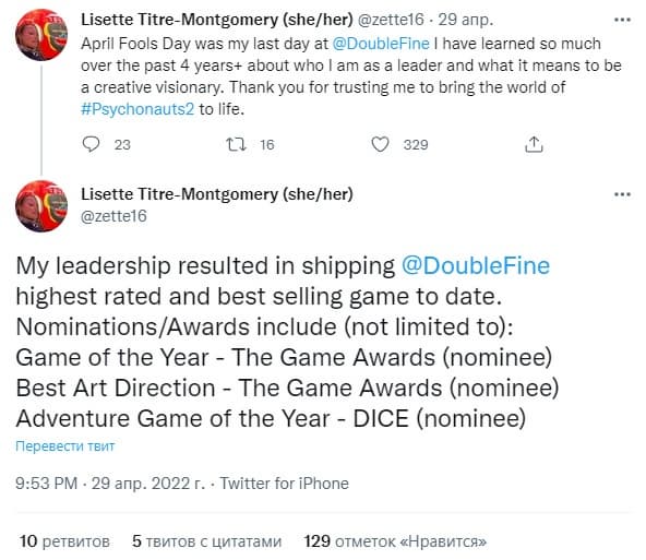 Появилось официальное подтверждение того, что игру также можно считать успешной с точки зрения продаж. И хотя точных данных нет, интересную информацию опубликовала Лизетт Титр-Монтгомери, которая в апреле ушла из Double Fine Productions после четырех лет работы. Она выступала в качестве арт-директора и несколько дней назад написала, что эта игра стала самой продаваемой в истории студии.