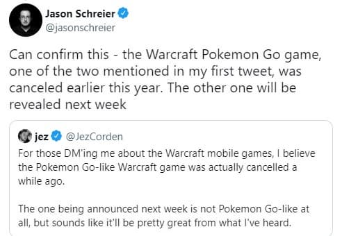 Совсем недавно Шрейер утверждал, что такая игра выйдет. Но теперь появилась информация, что Blizzard отменила мобильный продукт с дополненной реальностью, который должен был объединить реальный мир с Азеротом. Не исключено, что такому решению поспособствовал не слишком успешный релиз The Witcher: Monster Slayer от CD Projekt Red.