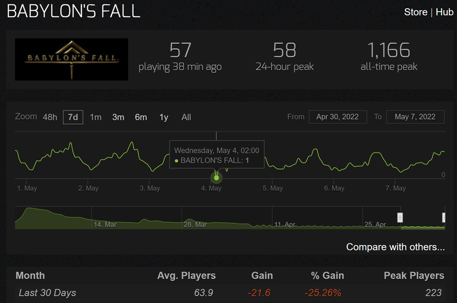 Тем не менее в последнее время онлайн Babylon's Fall в Steam поднимался до отметки в 80 игроков. Некоторым игра понравилась.