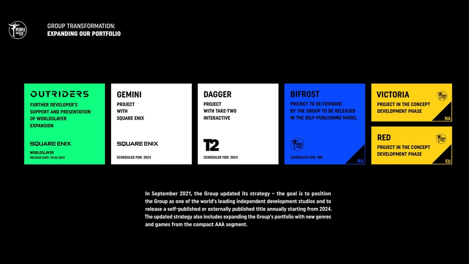 Студия People Can Fly сейчас работает пятью играми, включая Project Gemini для Square Enix, Project Dagger для Take-Two Interactive, одним собственным проектом и двумя играми в процессе проектирования.