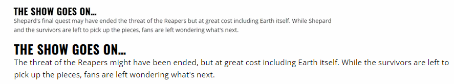 Позже описание скорректировали: «Угроза со стороны Жнецов, возможно, и была ликвидирована, но ценой больших потерь, в том числе и для самой Земли. Пока выжившим остаётся собирать осколки, фанаты гадают, что же будет дальше».