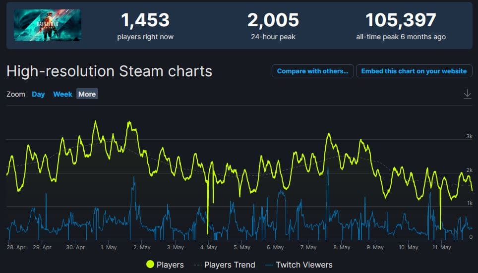 Тем временем Battlefield 2042 не удается преодолеть планку в 10 тысяч активных игроков с учетом всех платформ
