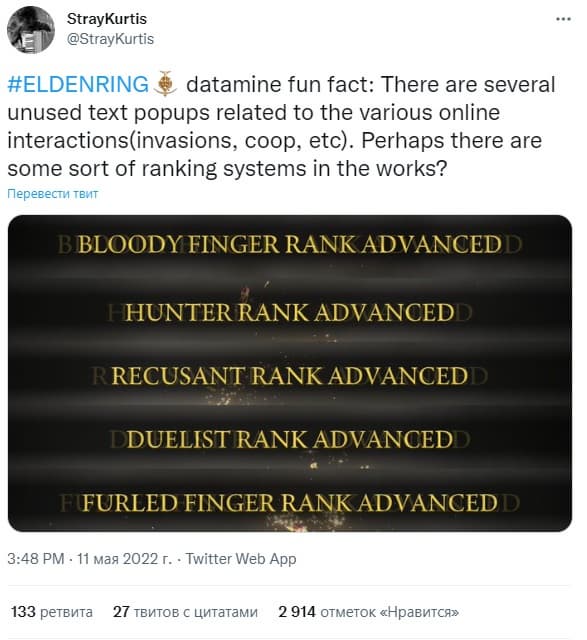 Похоже, в Elden Ring должны была присутствовать система рангов, используемая в играх серии Dark Souls. Остатки данного решения найдены в файлах.