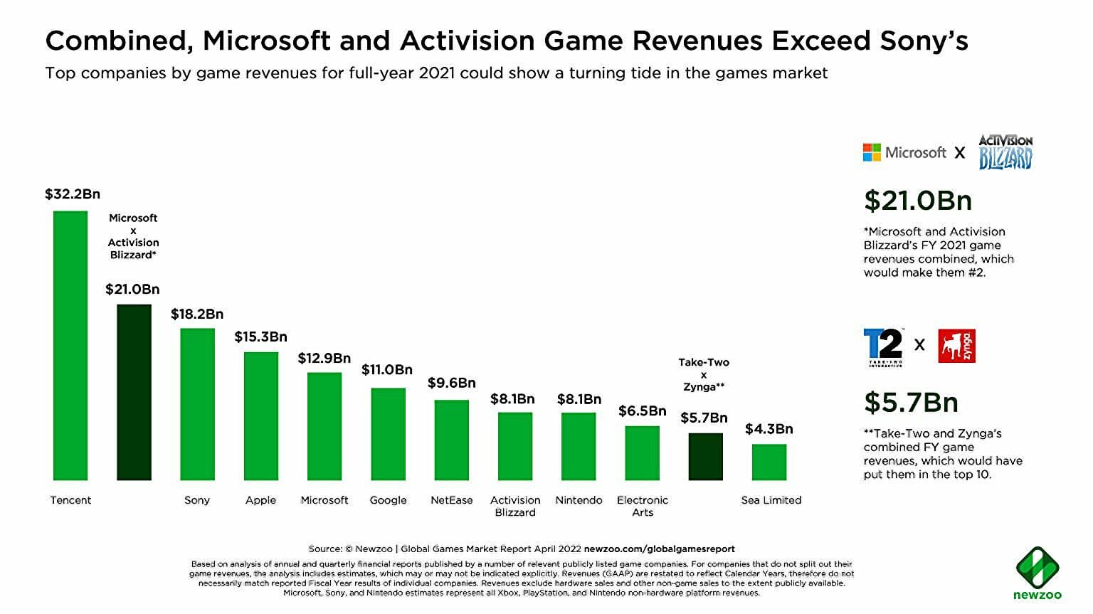 Стоит учесть одну деталь: когда сделка Microsoft-Activision Blizzard завершится, при условии одобрения Федеральной торговой комиссией США, слияние может привести к тому, что Sony станет третьей по величине игровой компанией после Tencent и Microsoft, согласно диаграмме Newzoo. Фирма, специализирующаяся на анализе и исследовании рынка игр и киберспорта, считает, что объединение доходов Microsoft и Activision позволит обойти Sony и Apple и занять второе место. Аналогично, если бы Take-Two уже владела мобильным издателем Zynga, она бы вошла в топ-10.